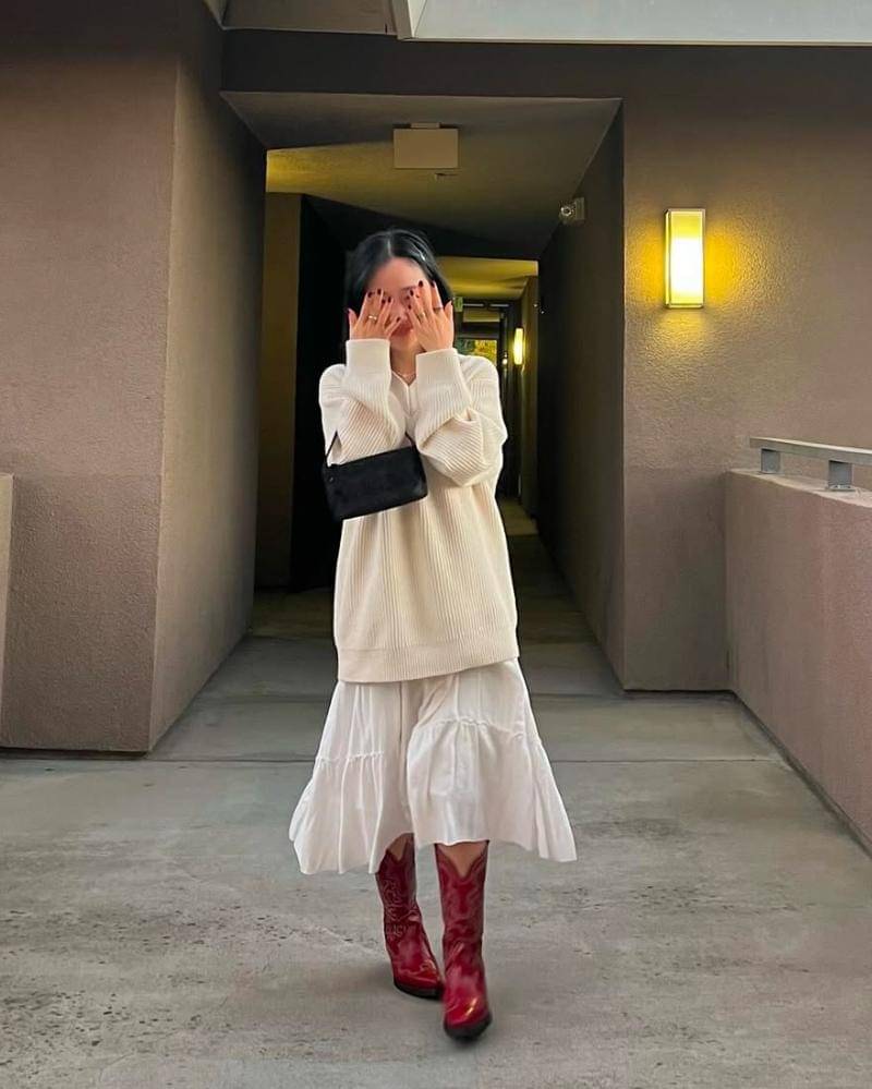 Padukan sweater panjang dengan rok dengan tekstur berlapis. Kamu bisa mengikuti palet warna Sarah yang ini, atau menyesuikan dengan keinginan Mama. Lalu, tambahkan tas untuk membawa barang-barang, serta sepatu yang trendi seperti boots merah yang dikenakan Kim. Lengkapi tampilan dengan kalung dan cincin berwarna emas atau perak, sesuai warna kulitmu.