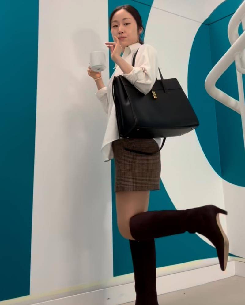 Untuk melengkapi tampilannya, Kim mengenakan ikat pinggang hitam, serta sepatu tabi cokelat gelap yang terlihat serasi dengan tas pada bahunya.