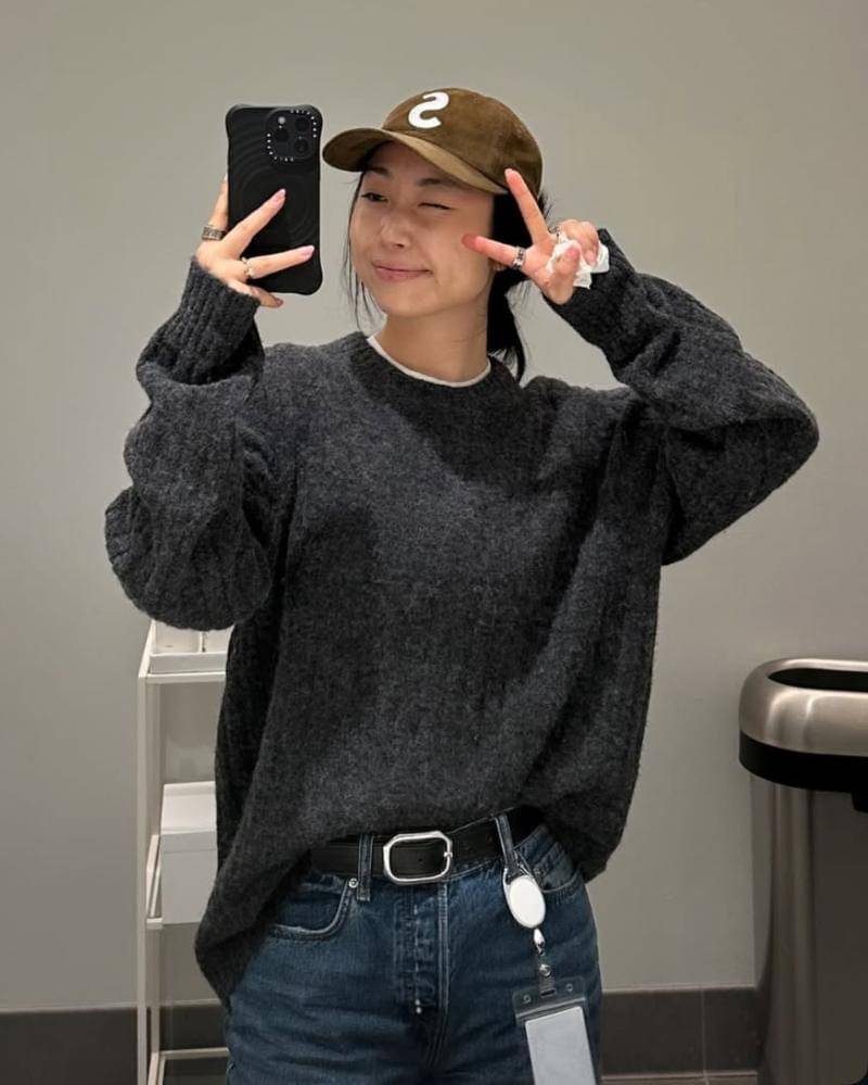 Paduan sweater dan jeans juga tidak pernah gagal. Gaya pakaian yang satu ini Kim lengkapi dengan topi baseball berwarna cokelat.
