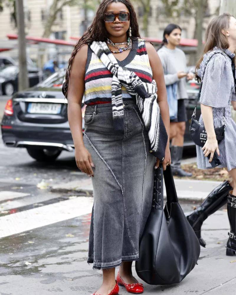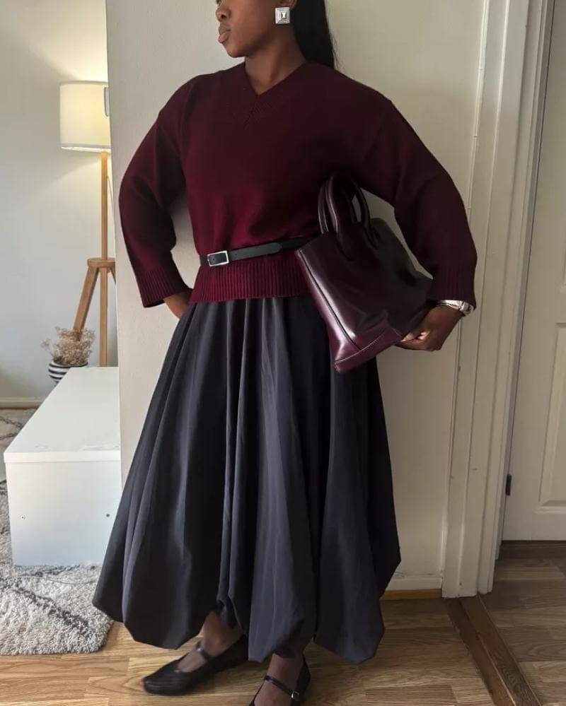 Kamu juga bisa menambahkan rok gelembung yang trendi dan sepatu ballet flats untuk melengkapi penampilan. Jangan lupa tas dengan bentuk yang tegas, serta perhiasan secukupnya, untuk memberikan tampilan yang anggun.