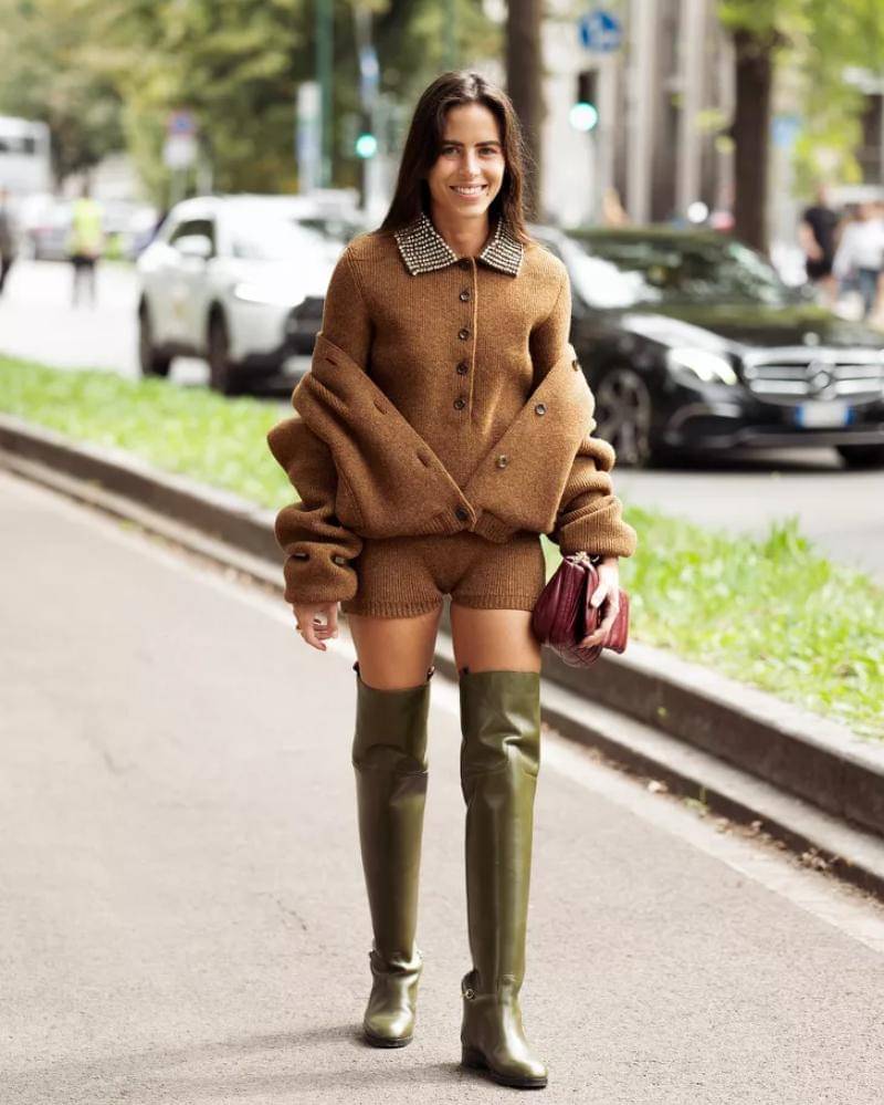 Lengkapi penampilan dengan sepatu boots suede atau kulit yang tinggi untuk memberikan sentuhan pesona musim gugur yang ekstra. Kamu bisa menyatu dengan musim gugur, memberikan kesan gaya hangat yang timeless.