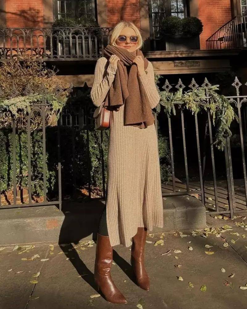 Ingin terlihat lebih feminim dengan outfit swetermu? Cobain gaya sweter dress, deh. Kenakan sweter dress yang simple, lalu padukan dengan syal lembut, agar kamu tetap hangat dan bergaya.