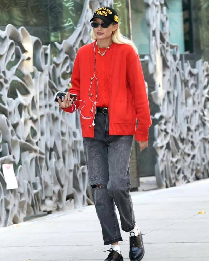 Paduan set kardigan dan sweter merah tomat yang menyala, dengan celana jeans abu-abu klasik dan sepatu loafer bertali yang edgy, merupakan pernyataan gaya yang berani dan trendi. Mama juga bisa tambahkan beberapa perhiasan dan ikat pinggang untuk menyempurnakan penampilan, layaknya Gigi Hadid di potret ini.