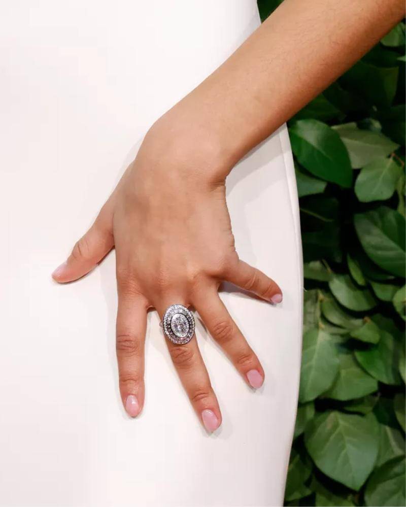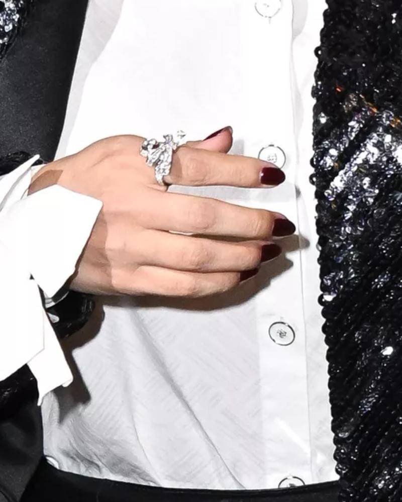 Zendaya melengkapi manikurnya dengan cincin berlian besar di jari tengahnya, gaya khas sang duta Bvlgari. Rambut kuncir kudanya yang ramping dihiasi dengan anting berlian dari merek yang sama, menciptakan penampilan minimalis namun elegan.