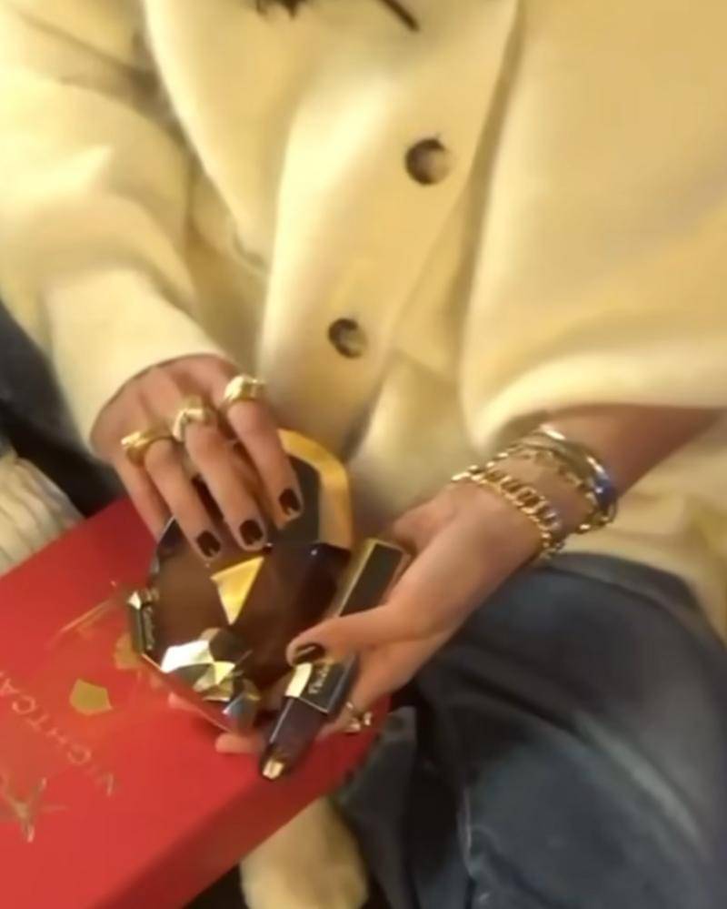 Mengenakan sweater rajutan wafel, berwarna abu-abu yang lembut dan celana panjang, ia membiarkan manikur merahnya yang mencolok menjadi pusat perhatian. Warna ini adalah pilihan yang sempurna bagi seseorang yang berbicara dengan gerakan tangan yang ekspresif.