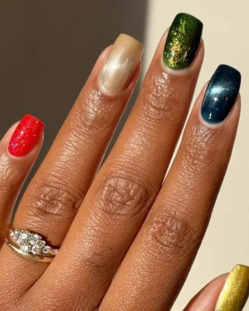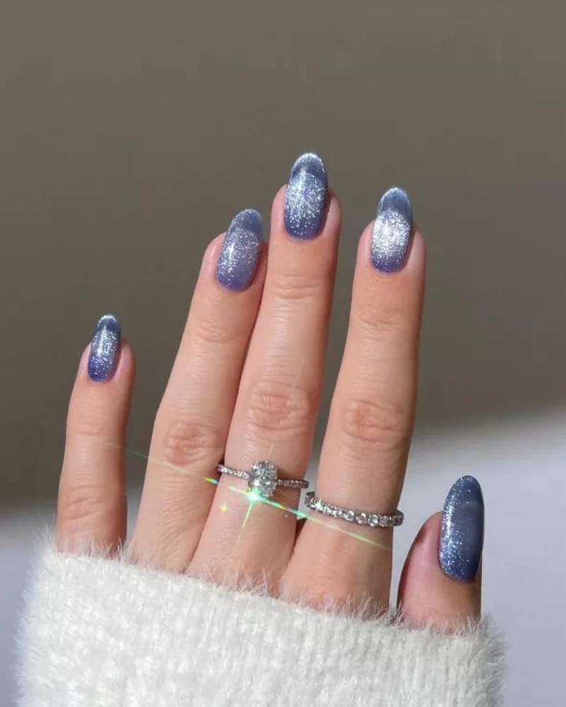 Desain ini memadukan kilauan, cat-eye, dan glitter foil, yang menangkap esensi musim dingin tahun ini. Gaya kuku yang satu ini pasti akan menarik perhatian siapapun.