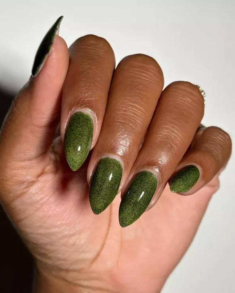Warna hijau tua dan aksen hitam memberikan kesan menyeramkan, sehingga cocok bagi siapa saja yang menginginkan tampilan kuku yang lebih dramatis.