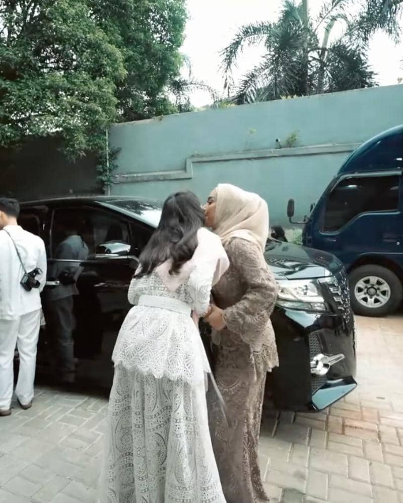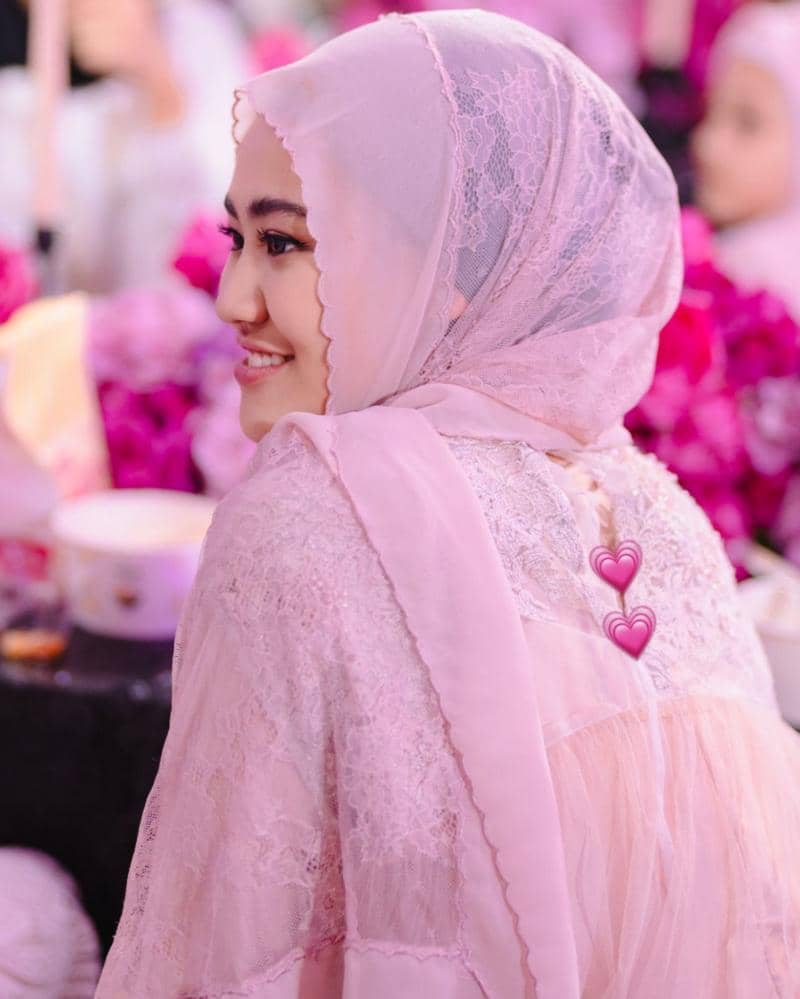 Artis yang dekat dengan adik Atta, Thariq Halilintar ini turut datang ke acara akikah baby Azura. Ia datang bersama Thariq menggunakan gamis dengan detail brokat dengan paduan warna emas dan pink. Ia juga membawa kain berwarna pink, untuk menutup kepalanya.
