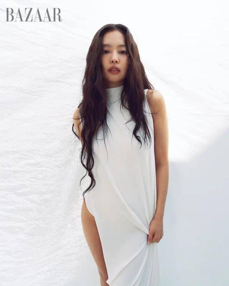 Dengan menatap kamera, Jennie memberikan pose dengan bibir yang setengah terbuka, dan kepala yang mendongak. Alhasil, jadilah potret editorial dengan kesan mahal ini.