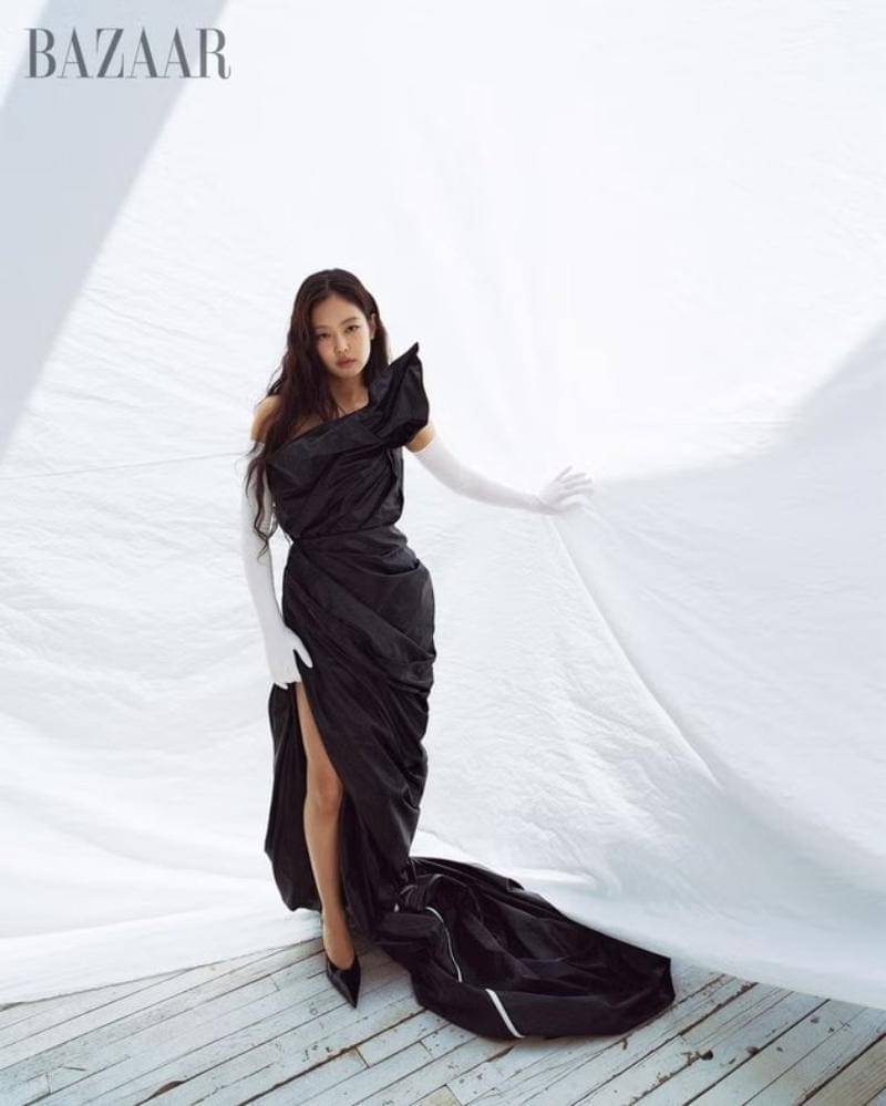 Pada potret lainnya, Mama bisa melihat Jennie yang mengganti busananya menjadi dress panjang berwarna hitam ini. Siluetnya bak lukisan seorang putri dongeng, siap memukau di pesta dansa tengah malam.