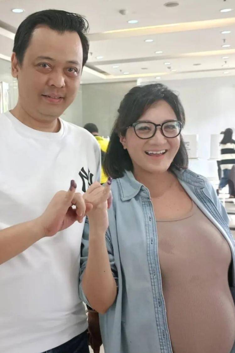 Meski baby bump-nya sudah terlihat sangat besar, Kiki tak pantang mundur untuk tetap mencoblon Paslon pilihannya. Ia mengenakan outer jeans dan tank top berwarna cokelat. Sang suami tampak menemani mengenakan kaos putih berlabel New Era.