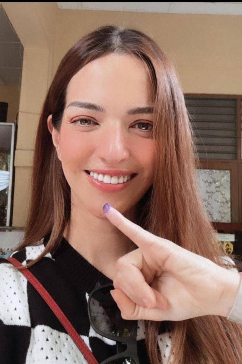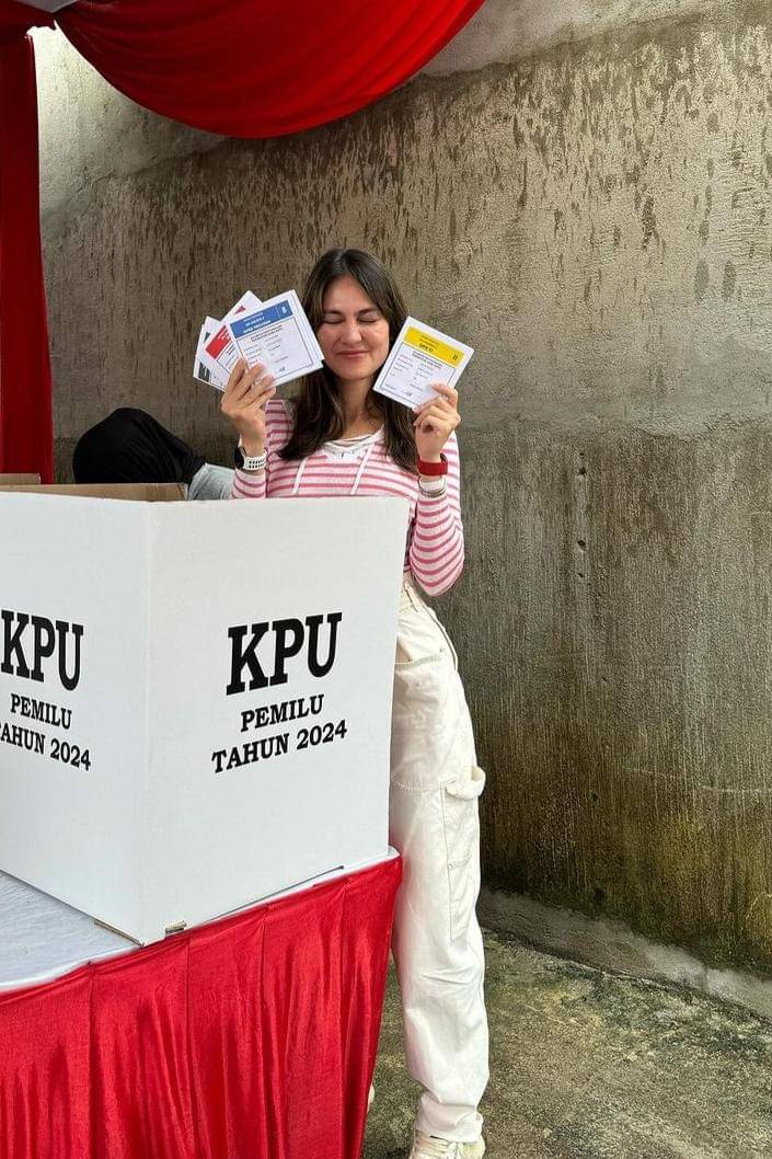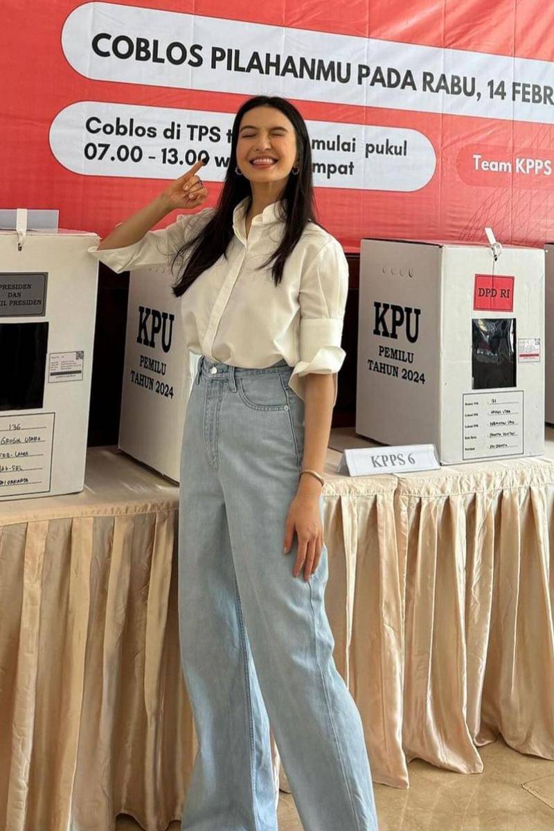 Ia sangat stylish dengan rambut hitamnya yang dibiarkan digerai. Riasan yang simpel tak melunturkan pesonanya saat berfoto di depan kotak suara.