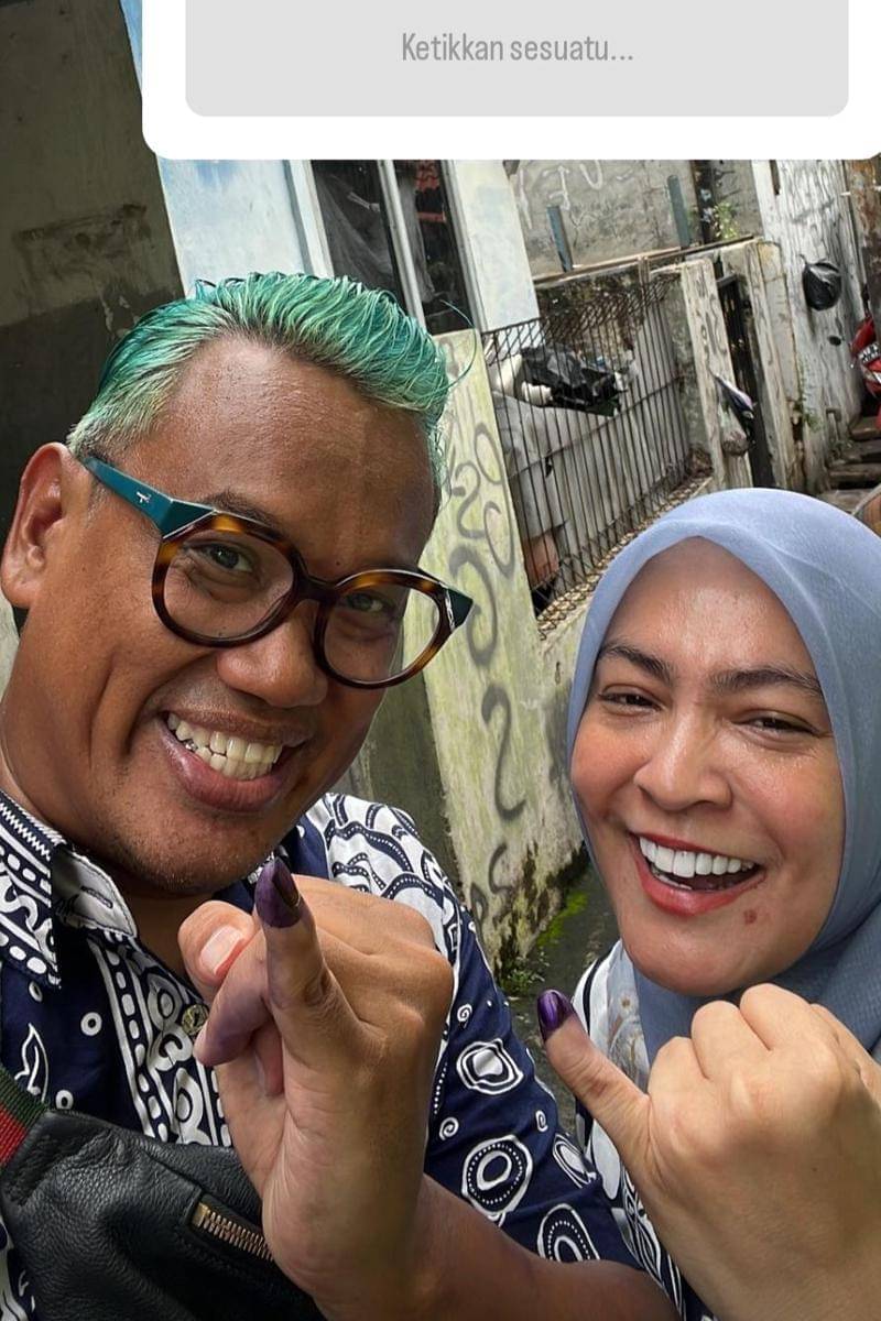Dengan rambut hijau, Uya Kuya tampak riang menunjukkan jarinya yang sudah dicelup tinta ungu tanda dirinya telah mencoblos. Astrid mengenakan hijab berwarna biru muda untuk melengkapi penampilannya saat datang ke TPS.