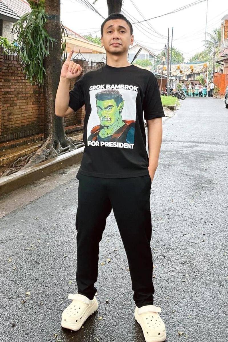 Raditya Dika tampil dengan t-shirt hitam nyeleneh bertuliskan Grok Bambrok for president.