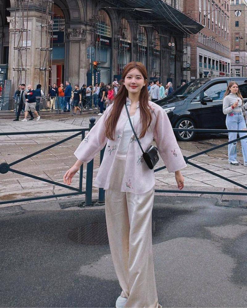 Zhao Lusi tentunya juga perlu jalan-jalan dan berlibur. Nah, di saat-saat seperti itu, ia memilih untuk menggunakan outfit yang kasual. Seperti outfit unik yang satu ini. Ia mengkombinasikan gaya modern dengan tradisional.