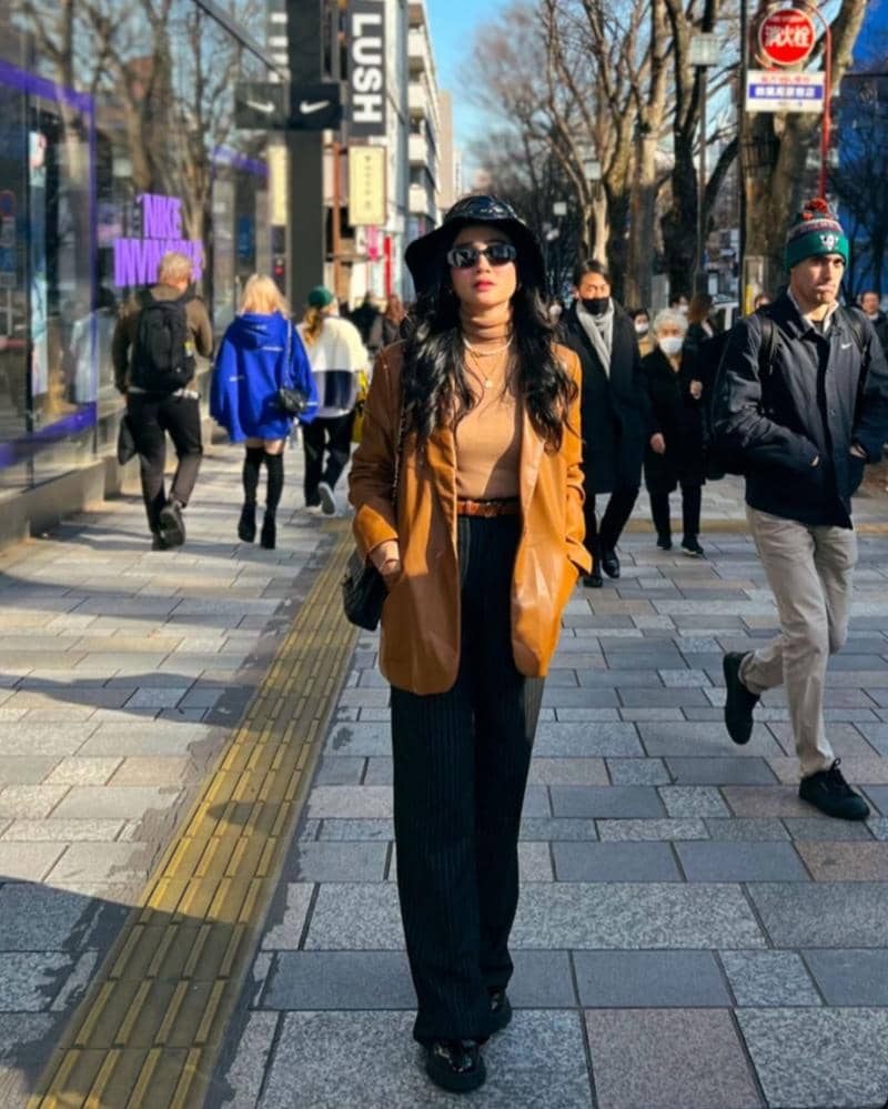 Nah, kalau gaya Febby ketika berkunjung ke Jepang, cocok untuk kamu yang ingin tampak mahal dengan gaya semi-formal, nih. Gaya yang satu ini cocok untuk kamu yang punya business trip sekaligus ingin traveling.