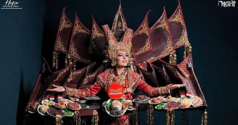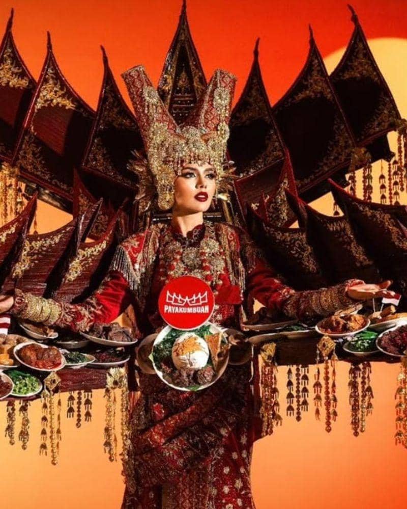 Menu yang dihadirkan dalam busana tersebut mencakupi rendang, ayam pop, sayur singkong, gulai babat, dan sayur nangka.