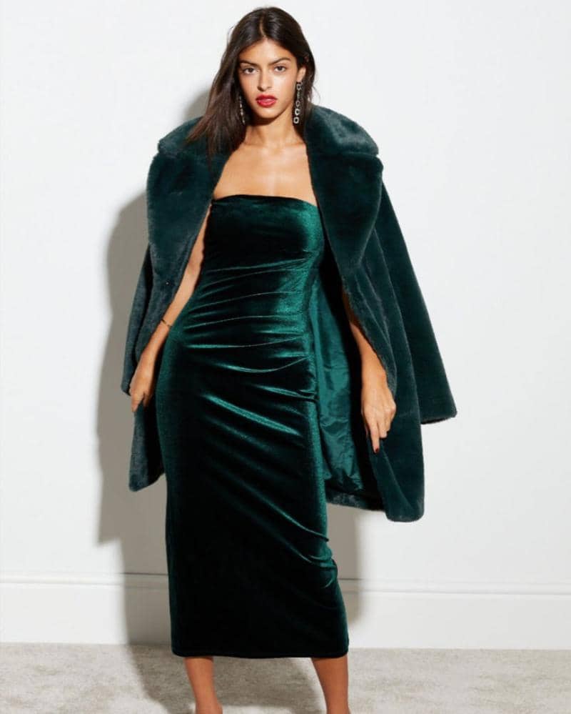 Beludru merupakan pilihan yang mewah untuk acara liburan. Gaun panjang beludru zamrud gelap atau biru kehijauan dapat memberikan kesan yang memukau.