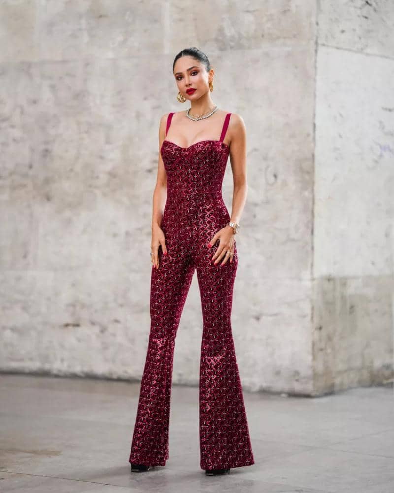 Jumpsuit beludru menawarkan alternatif gaya untuk setelan formal, yang menciptakan keseimbangan sempurna antara gaya modern dan kepraktisan. Siluetnya yang elegan namun ceria membuatnya cocok untuk berbagai acara, mulai dari pesta formal hingga acara santai.