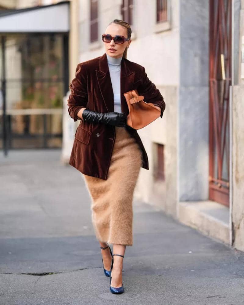 Coba deh, padukan blazer beludru dengan turtleneck tipis dan rok panjang berbahan bulu domba untuk tampilan yang bergaya dan nyaman, cocok untuk acara kerja maupun acara kasual.