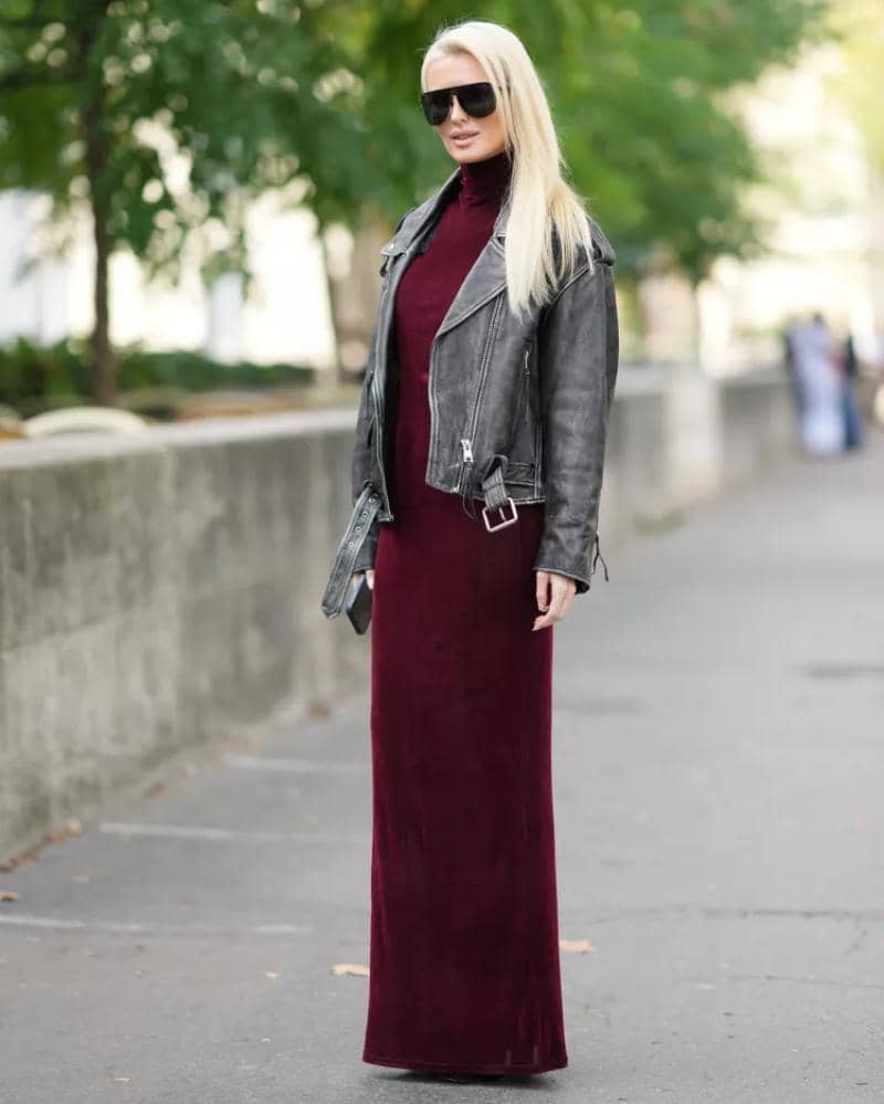 Gaun beludru dapat dengan mudah ditata untuk acara kasual juga, kok. Padukan gaun panjang beludru berleher tinggi dengan jaket kulit hitam atau jaket denim, untuk tampilan yang anggun dan santai.