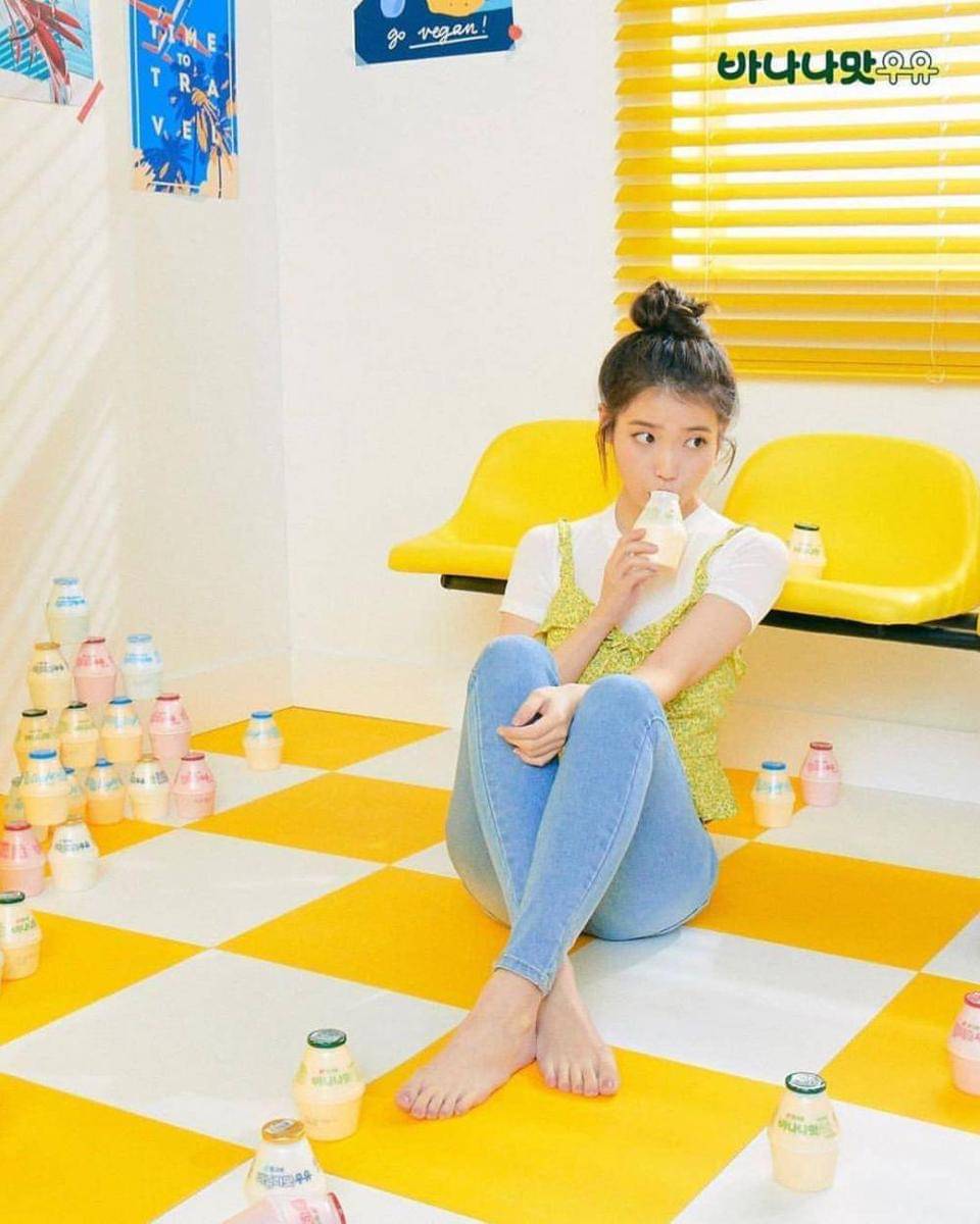Untuk tampilan yang lebih chic, kamu bisa mensontek gaya IU yang mengenakan kaus berwarna putih, kemudian dibalut flower top kuning agar tidak sepenuhnya polos.