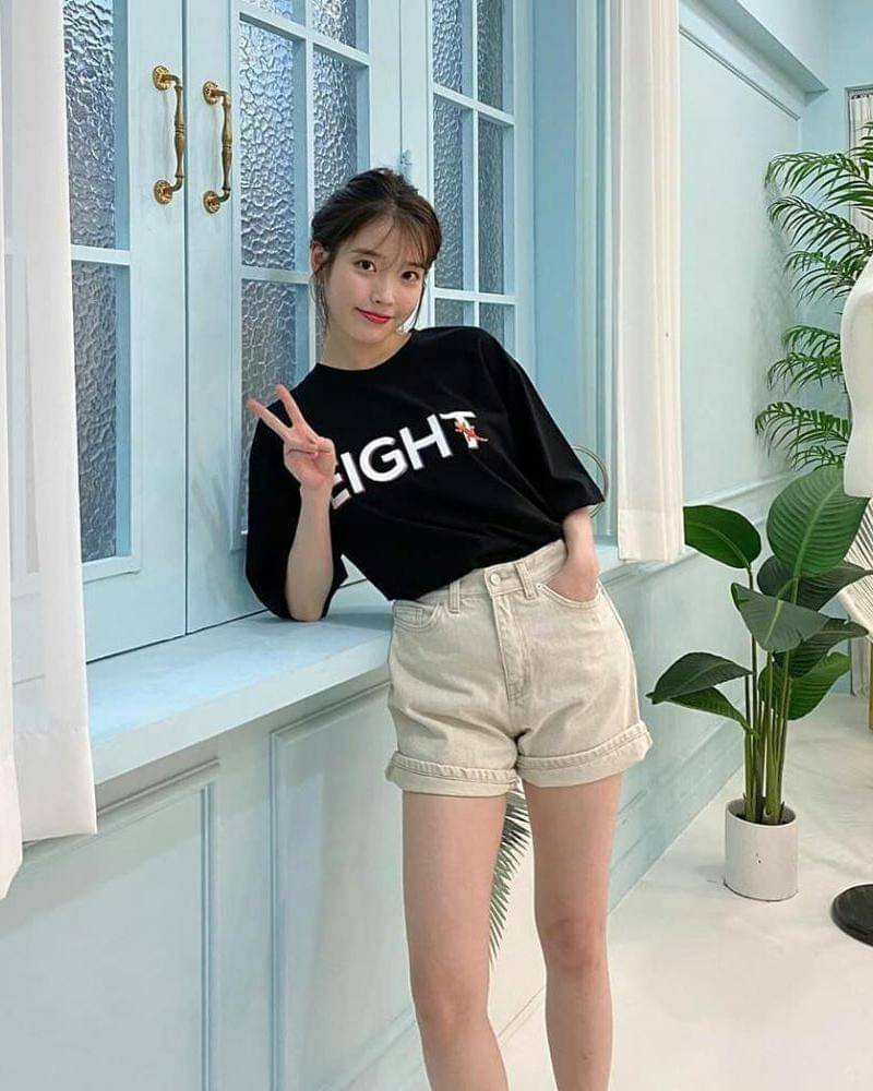 Kalau gaya satu ini cocok untuk outfit rumahan. Untuk atasan, kamu bisa mengenakan kaus pendek berwarna hitam seperti yang dikenakan IU ini.