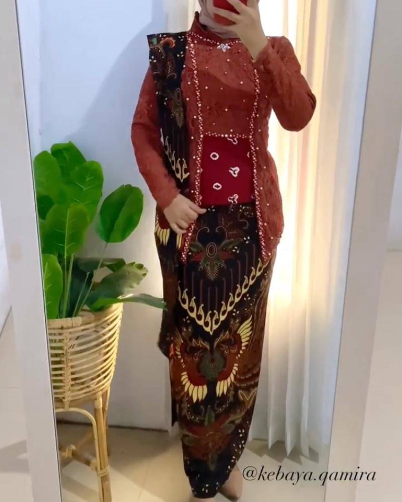 Gaya kebaya yang satu ini cocok untuk Mama, pecinta bahan brokat. Kebaya dengan warna cokelat yang nggak norak ini, dihiasi motif-motif unik, dari kain brokat. Pada bagian tengah kebaya terdapat kancing yang memastikan kebaya tertutup rapi, diikuti stagen pada bagian perut.