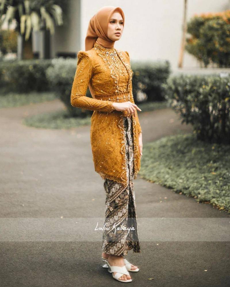 Kebaya kutubaru yang satu ini juga tidak kalah stylish. Dengan warna mustard, kebaya Mama pasti akan terlihat berbeda. Didesain dengan bagian leher yang tinggi agar hijab friendly, serta gaya elegan dari bahu tinggi, buat kebaya satu ini wajib kamu pertimbangkan.