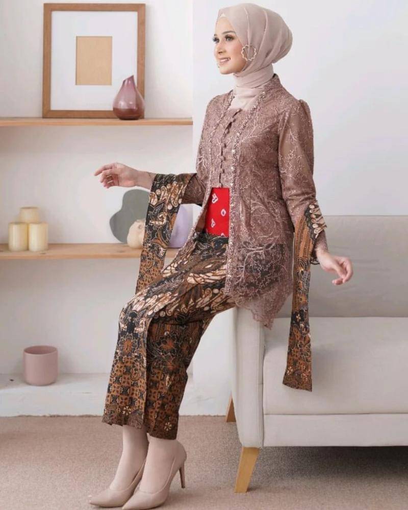 Kebaya satu ini dibuat dari kain brokat, membuatnya terlihat mewah. Hiasan bros di bagain tengah dada, juga mempercantik look satu ini. Belum lagi paduan manset yang berwarna pas dengan kebaya, akan sangat cocok untuk Mama yang berhijab.