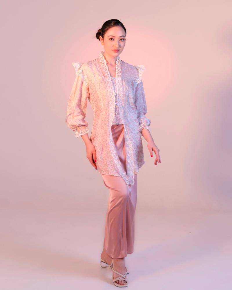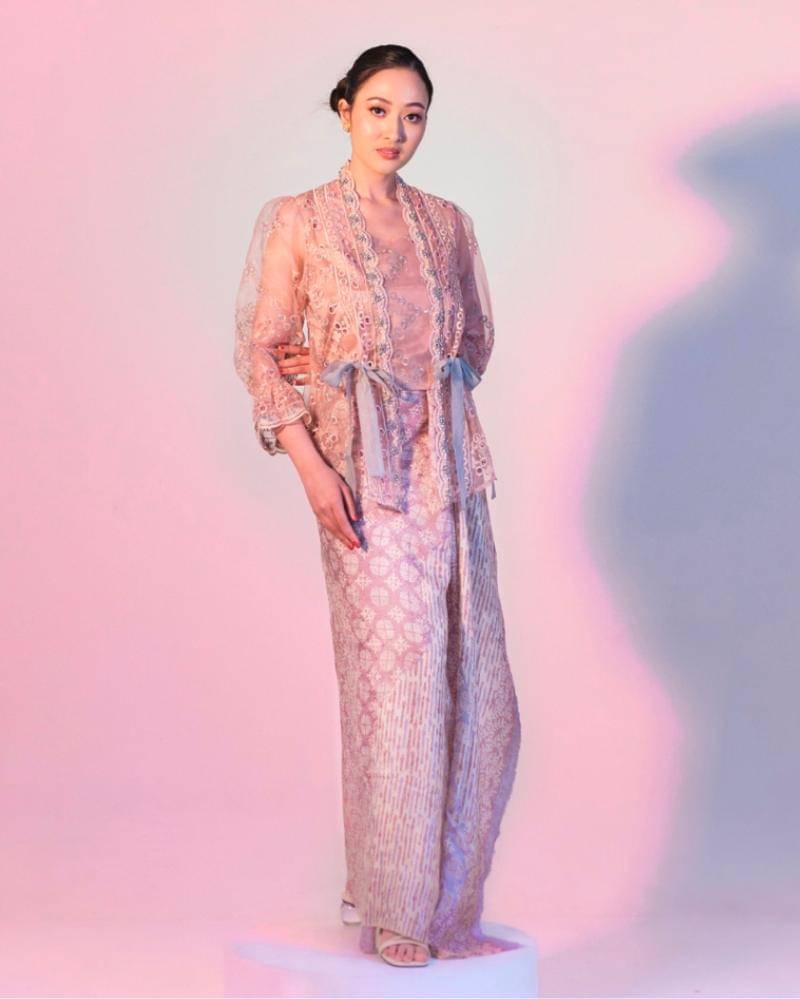Memiliki lengan yang puffy dan semi-transparan, diikuti dengan lace pada bordir pakaian, membuat kebaya satu ini semakin menawan. Permainan kain yang saling dilapiskan satu dengan yang lainnya, pada bagian tengah kebaya, juga memberikan penampilan yang unik.