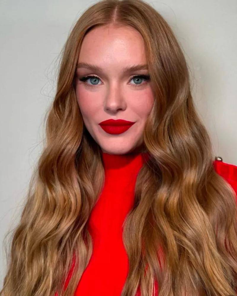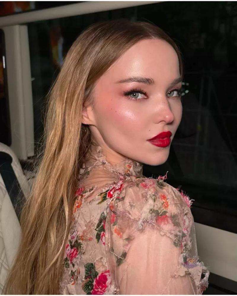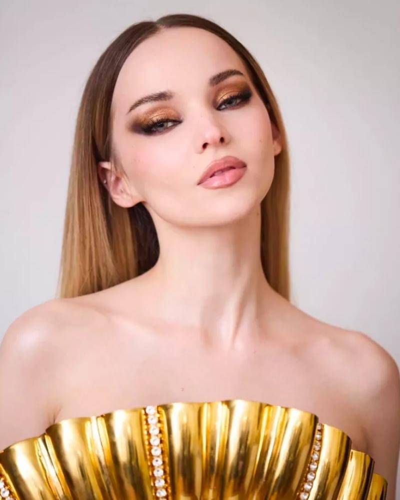 Make up dengan warna emas pada Dove Cameron ini, merupakan pilihan yang memukau untuk musim perayaan atau awal tahun baru. Untuk mendapatkan tampilan ini, aplikasikan eyeshadow berkilau pada kelopak mata Mama, baik dalam bentuk bubuk maupun krim, itu tidak masalah.