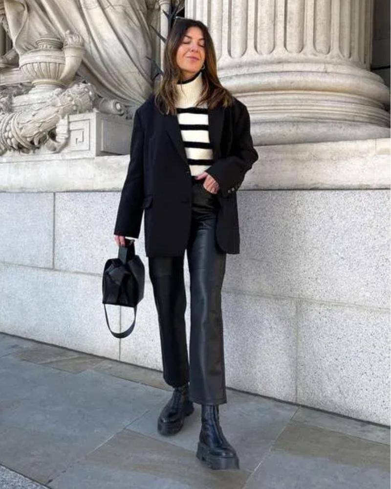Nah, gaya yang satu ini cocok untuk kamu yang ingin pergi ke area sejuk, atau mungkin sedang menghadapi cuaca yang mulai dingin. Padukan jumper berbahan wool-knit dengan celana panjang berbahan kulit, lalu lapisi dengan coat atau blazer hitam.