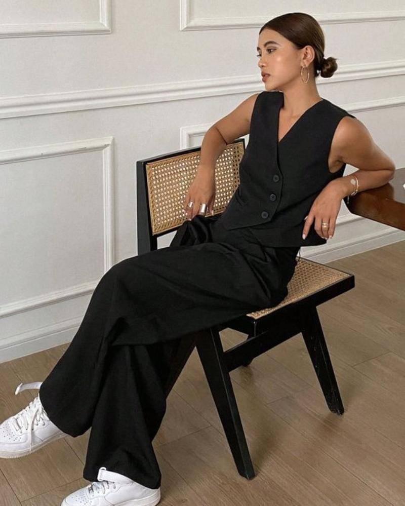 Gaya yang menjadi tren ini memadukan vest yang bergaya crop dipadukan dengan celana highwaist, dengan warna yang sama. Mama bisa tambahkan perhiasan berwarna emas, silver atau perunggu, untuk membuat gaya satu ini tidak biasa-biasa saja.
