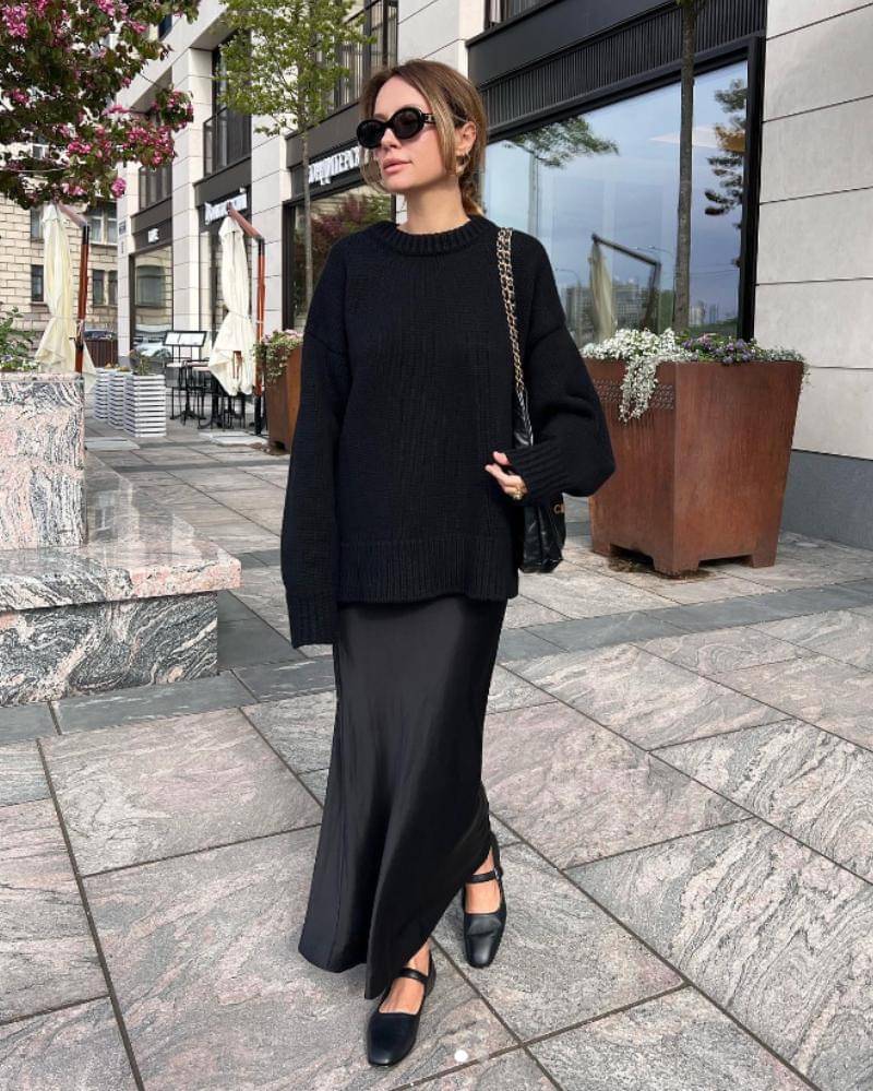 Gaya pertama yang bisa kamu coba adalah yang satu ini. Padukan sweter oversize, berlengan panjang dan sedikit gombrong, yang memberikan kenyamanan ekstra, dengan rok panjang semata kaki.