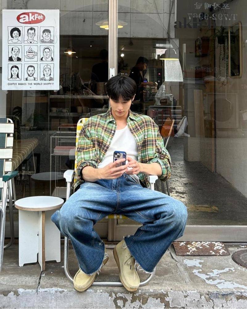 Gaya yang satu ini sangatlah timeless, jadi nggak perlu khawatir ketinggalan tren. Tambahkan sepatu yang menonjol, seperti Woo Seok yang menggunakan boots berwarna cokelat terang. Gaya yang satu ini cocok untuk kamu yang mau bebas ribet, deh!