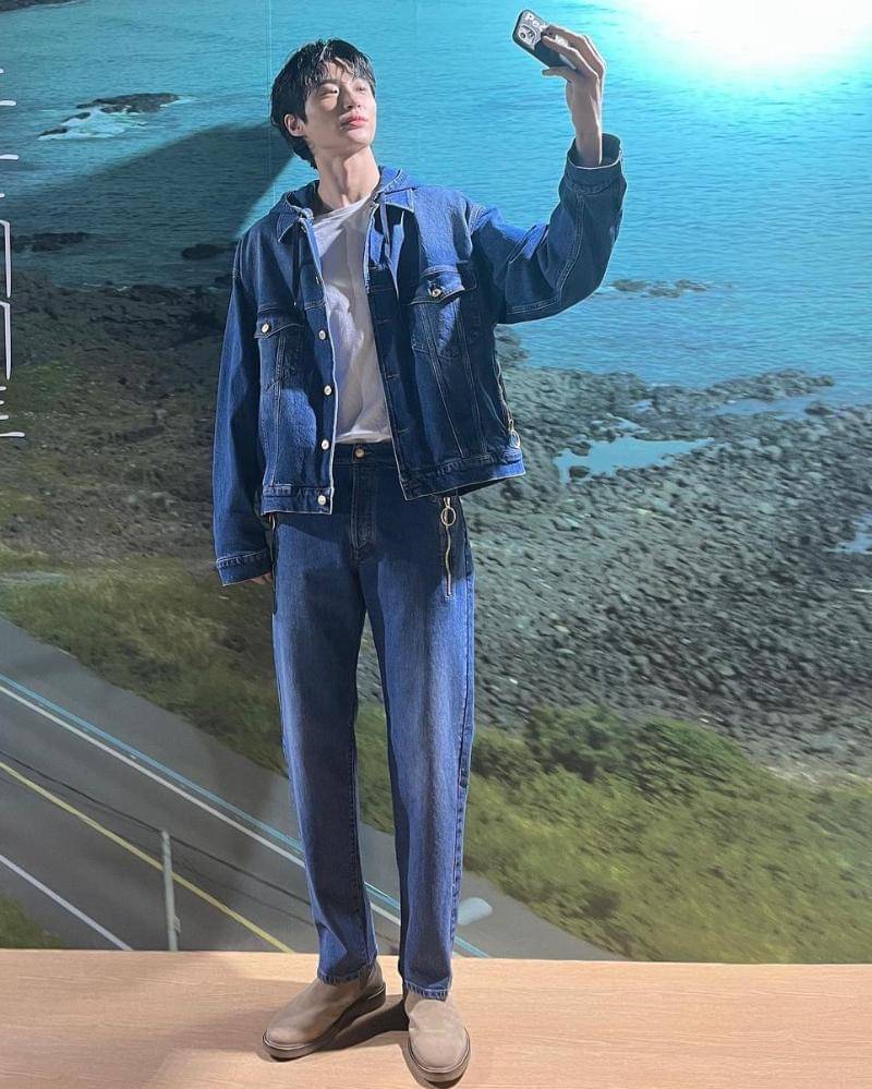 Byeon Woo Seok kali ini memadukan kaus putih, dengan jaket jeans dan celana jeans yang berwarna senada. Untuk menyempurnakan busananya ia mengenakan sepatu berwarna cokelat, memberikan percikan warna lain pada penampilannya.