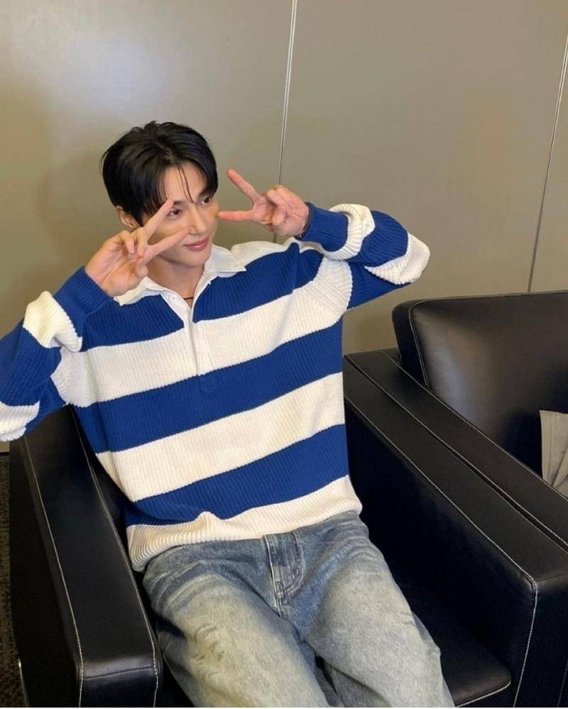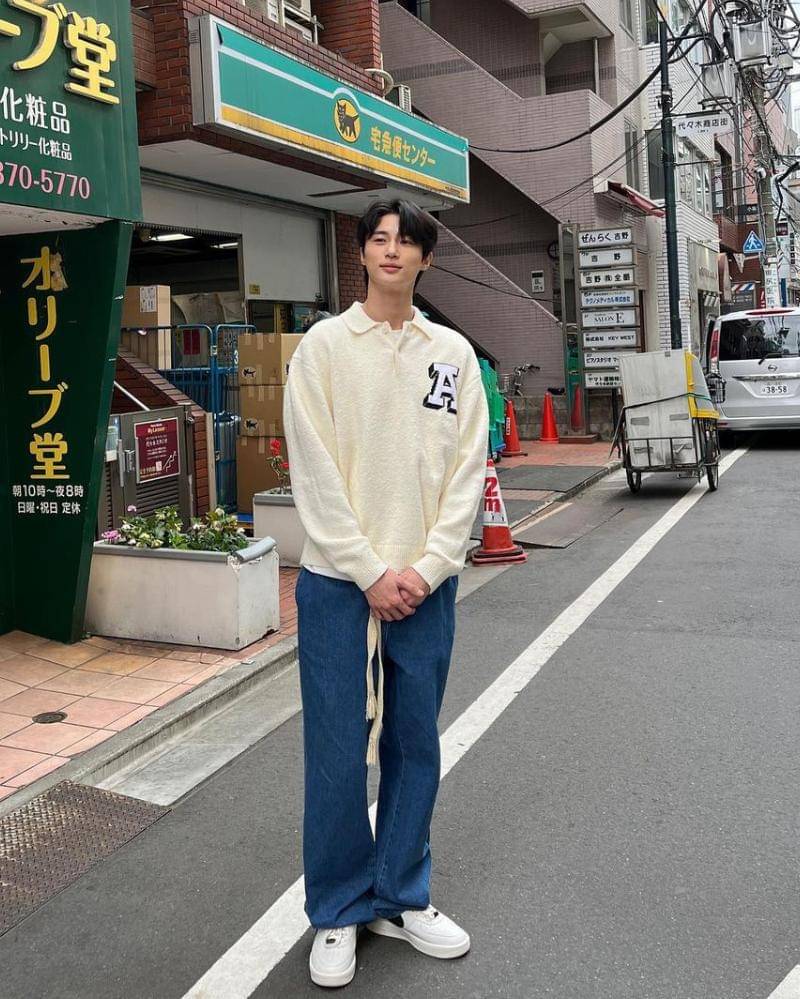 Kuncinya ada pada padupadanan busana. Padukan atasan berlengan panjang dengan jeans biru yang sederhana. Jika cuaca sedikit dingin, kamu bisa juga menambahkan kaus dibawahnya, seperti yang dikenakan Woo Seok kali ini.