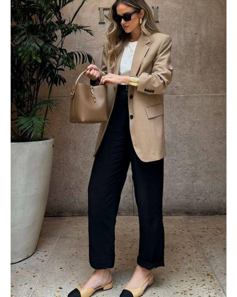 - Blazer, Top, Pants, and Flats: Blazer oversize dipadukan dengan blus atau kaus putih memberikan penampilan sederhana namun sophisticated untuk kembali ke kantor.