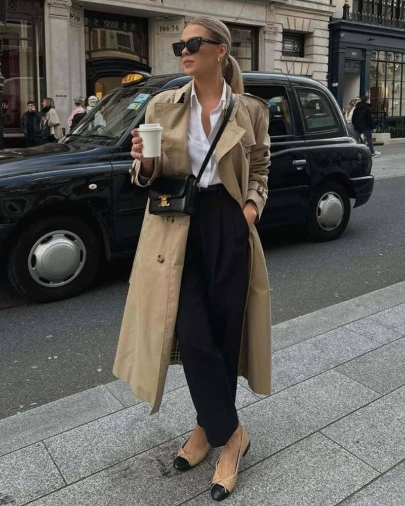 Padukan mantel panjang alias trench coat yang mencolok dan oversized dengan kemeja klasik yang dimasukkan ke dalam dan celana panjang yang disesuaikan. Akhiri dengan sepatu hak klasik untuk pakaian kerja yang tak lekang oleh waktu dan mudah dipakai.