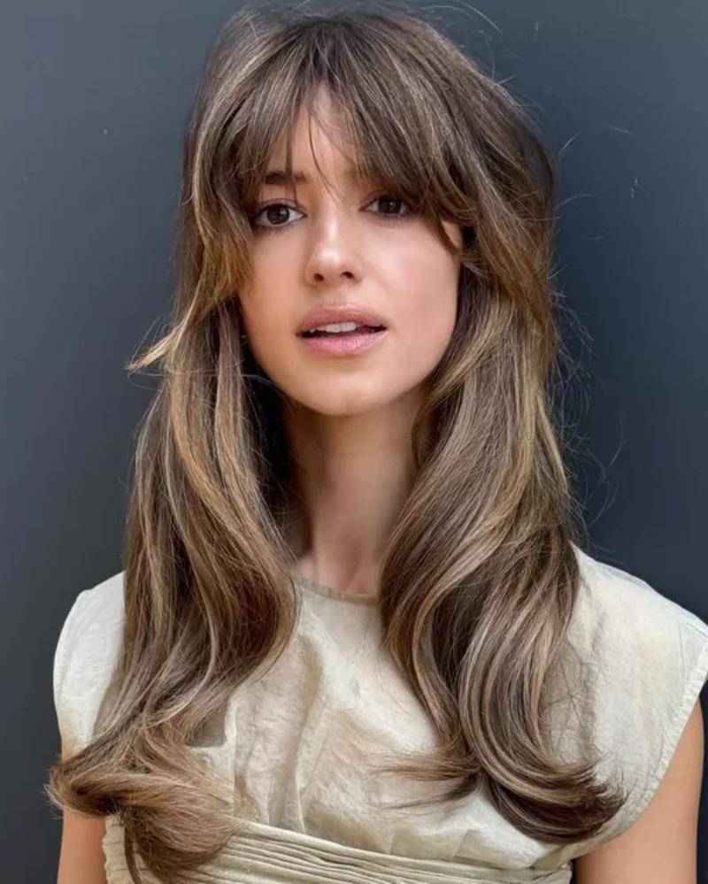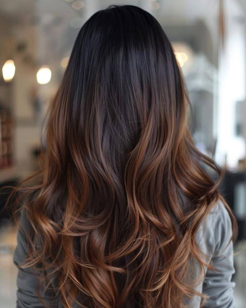 Warna dasar gelapnya yang pekat berangsur-angsur berubah menjadi warna cokelat susu yang lebih lembut, menciptakan dimensi yang halus dan elegan pada rambut bergelombangnya yang panjang dan berkibar. Tampilan ini mempertahankan warna rambut alaminya sekaligus menambahkan sentuhan kehangatan dan kedalaman.