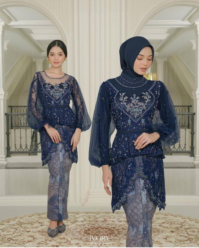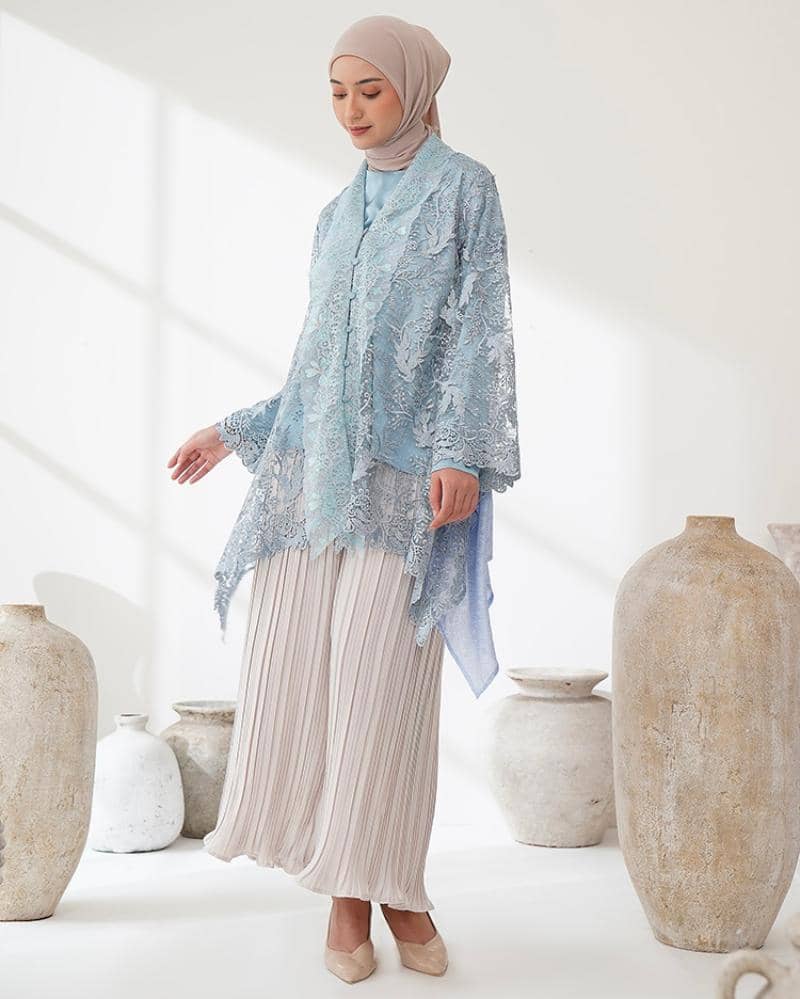 Desain lengan balon semi-transparan serta peplum dress di bagian pinggang, menambah gaya khas kebaya modern zaman sekarang. Kebaya satu ini cocok dipadukan dengan hampir semua warna kain batik, karena warnanya yang cukup netral. Mama tinggal pasangkan dengan hijab berwarna senada.