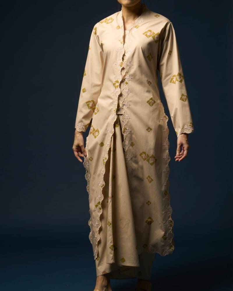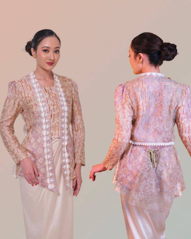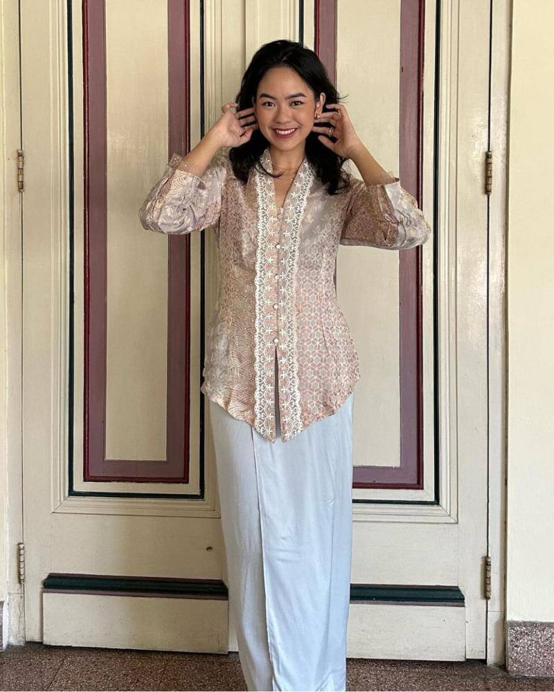 Kebaya yang satu ini memberikan gaya yang berbeda, kalau kebanyakan kebaya berhenti di bagian pinggul, kebaya yang satu ini berhenti dekat mata kaki. Kebaya berwarna krem dengan motif diamond, serta bordir berenda, membuat kebaya satu ini terlihat anggun.