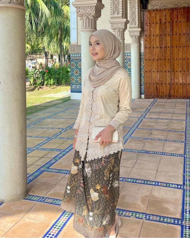 Memiliki model seperti kebaya kebanyakan, dengan brokat pada ujung-ujung bagian atasan, daya tarik kebaya ini ada pada paduan warna buminya. Atasan berlengan panjang berwarna krem, dipadukan dengan hijab berwarna cokelat terang, lalu dilengkapi dengan rok batik berwarna cokelat gelap yang melebar.