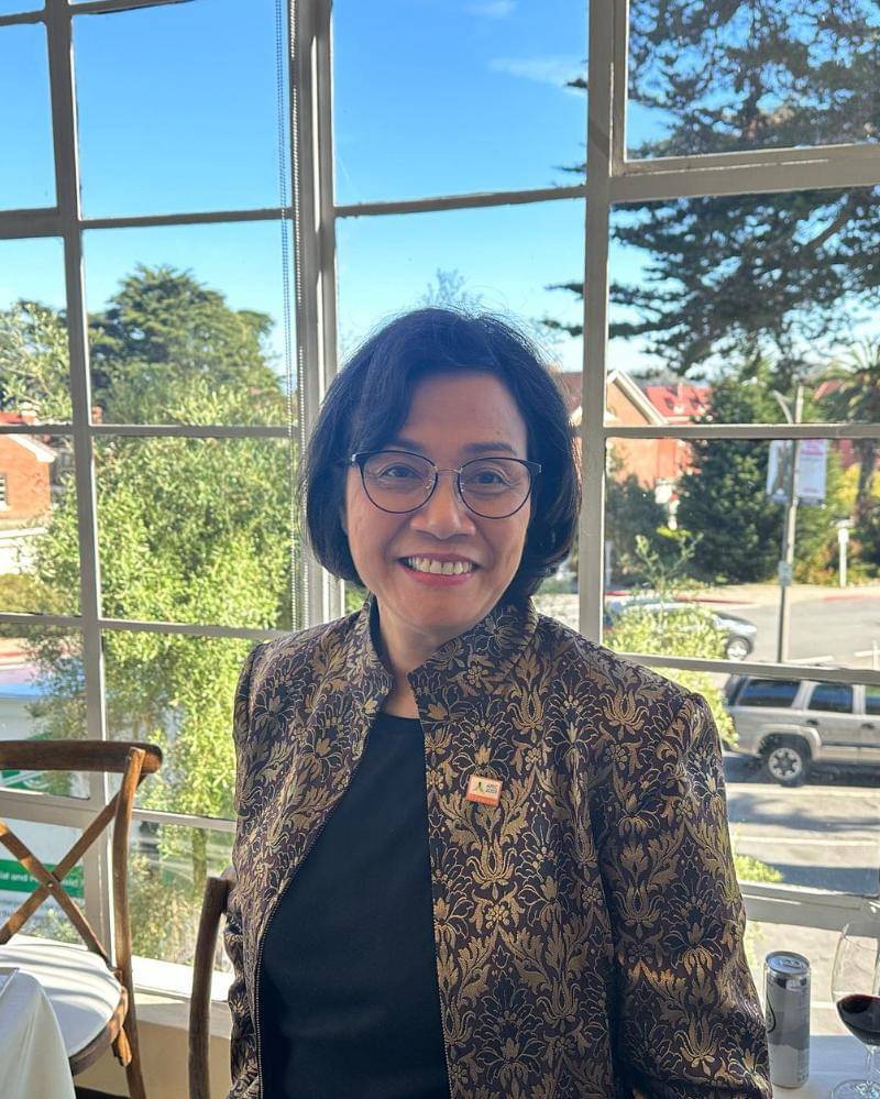 Pada hari pertama pertemuan Menteri Keuangan APEC (Asia Pacific Economic Cooperation) 2023 yang berlangsung pada 13 November 2023 di San Francisco, Sri Mulyani menunjukkan pesonanya dengan mengenakan outer batik berwarna cokelat keemasan yang dilengkapi aksen embos yang menarik.