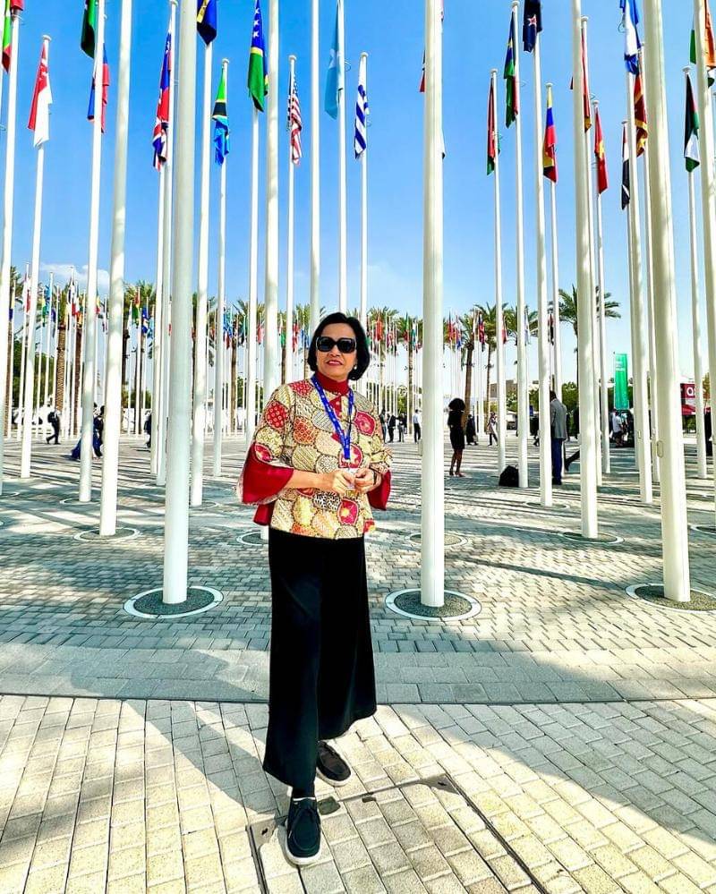 Saat menghadiri COP 28 di Expo City Dubai, Sri Mulyani tampil anggun dengan mengenakan batik Sekar Jagad, yang telah menjadi pilihan andalannya dalam berbagai acara, termasuk dalam momen Istana Berbatik. Ia memadukan batik tersebut dengan celana palazzo berwarna hitam, menciptakan kesan yang elegan dan modern.