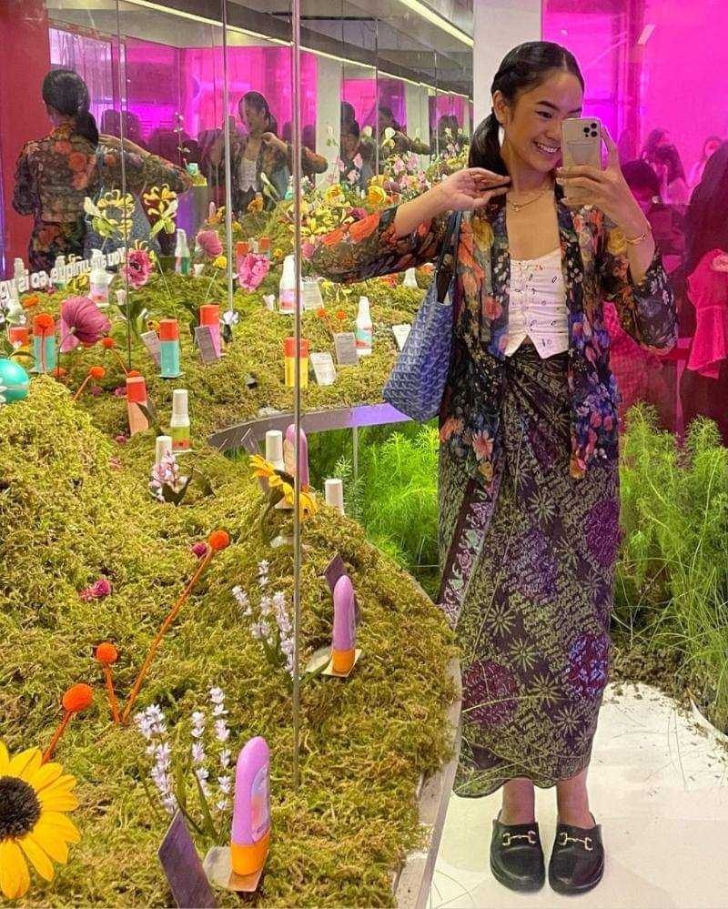 Penampilan itu diperindah dengan motif-motif bunga warna pink dan pola batik lainnya, serta tote bag warna warni yang menawan.