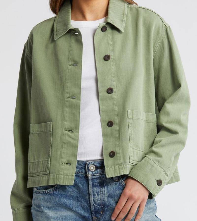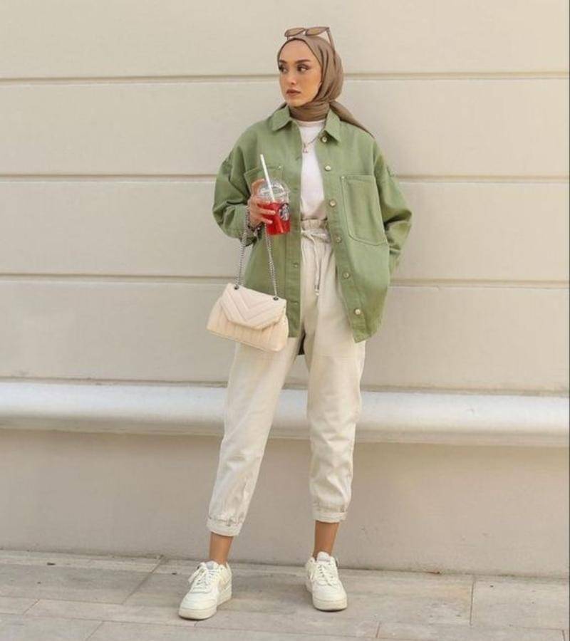 Jaket dengan warna sage yang netral mampu memberikan kontras yang menarik, terutama saat dipadukan dengan celana jeans.