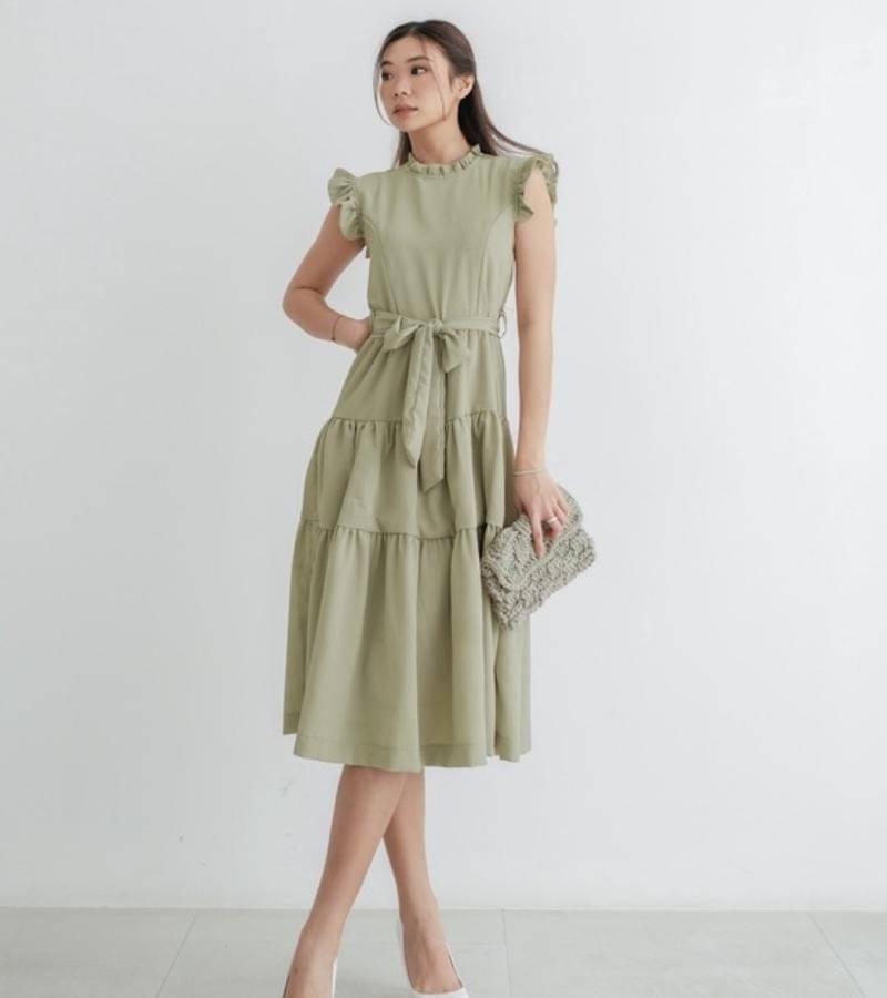Pilihlah gaun midi berwarna sage dengan potongan sederhana seperti renda ataupun detail tali ikat di bagian pinggang, serta tas tangan untuk melengkapi penampilan.
