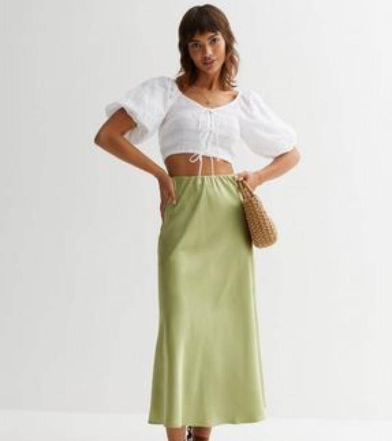 4. Padukan rok midi berwarna sage dengan off-shoulder top untuk tampil feminim